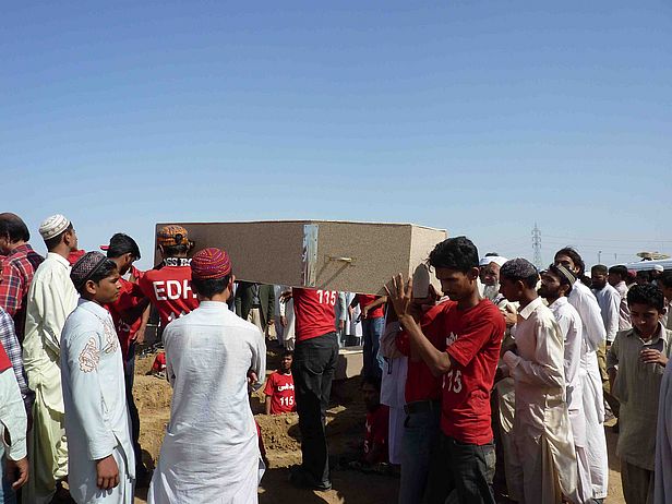 Die Zeremonie zur Beerdigung der letzten Toten begann auf einem Platz inmitten des Industriegebiets im Westen Karatschis, das den Namen „Small Industry and Trade Estate“ (SITE) trägt und am Rande des Stadtteils Baldia Town liegt. Versammelt waren Überlebende und Hinterbliebene, Leute aus der Nachbarschaft, Gewerkschafter und Menschenrechtsaktivisten. Anwesend war auch mit Gewehren bewaffnete Polizei und natürlich eine Vielzahl von Journalisten pakistanischer Zeitungen, Radio- und TV-Stationen. Wir selbst begleiteten Nasir Mansoor und die Kolleginnen und Kollegen der NTUF. Mitten auf dem Platz lagerten die siebzehn Särge, einfachste, völlig schmucklose Holzkisten. Da die Leichname nicht zu identifizieren waren, hatte man sie fortlaufend mit einer polizeilichen Kennziffer und dem Wort „Edih“ beschriftet – dem Namen des karitativen Unternehmens, das die Bestattung übernommen hat. Nach einer kurzen Zeremonie luden Edih-Mitarbeiter je einen der Särge auf einen japanischen Kleintransporter, eskortiert von der Polizei machten sich die siebzehn Fahrzeuge gleich danach zum Friedhof von Baldia Town auf. Während die meisten Nachbarn auf dem Platz zurückblieben, folgten die Angehörigen, der Journalistenpulk und wir selbst der Kolonne der Särge mit unseren eigenen Kleinbussen, PKW und Mopeds; wer kein eigenes Fahrzeug hatte, bestieg eine der vielen verbeulten Motorrikschas.
