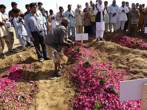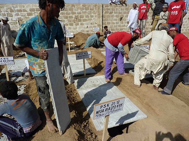 Unsere Kolonne führte auch an der Ruine von Ali Enterprises vorbei, einem Eckgebäude zu der Ausfallstraße, die SITE mit Baldia Town verbindet. Nach noch einmal fünfminütiger Fahrt erreichen wir den Friedhof: ein ebenfalls staubiges, hügeliges Areal, auf dem zwischen meist verwahrlosten Gräbern einzelne längst verdorrte Pflanzen stehen. Die Edih-Transporter fahren einer nach dem anderen durch das Haupttor, gefolgt von den Kleinbussen der Radio- und TV-Stationen und den Jeeps der Polizei. Wie die Überlebenden und Hinterbliebenen lassen wir unser Fahrzeug am Eingang zurück und gehen zu Fuß zu dem Grundstück, das den Toten zur letzten Heimstatt werden soll. Weil die siebzehn Gräber zuvor schon ausgehoben wurden, können die Särge binnen weniger Minuten in die trockene Erde gelegt werden. Zwischen den mit rotem T-Shirt bekleideten Ehdi-Mitarbeiter suchen Journalisten und Trauergäste ein Platz mit Sicht auf die hektische Aktion. Während die Techniker ihre Kameras und Mikrofone in Position zu bringen suchen, bemüht sich die Polizei, in dem unübersichtlichen Gewühl Ordnung zu schaffen. Als der Auftrieb zu wild wird, zieht einer der Beamten die Pistole, um seinen Kommandos Nachdruck zu verleihen.