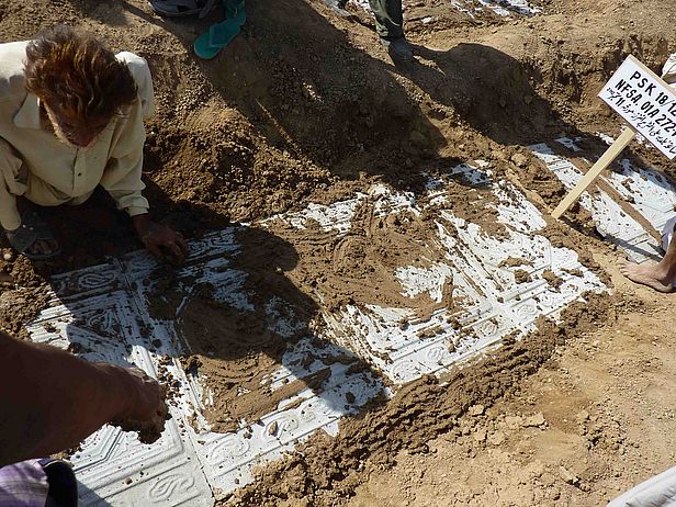Die Mitarbeiter von Ehdi haben die Gräber mittlerweile mit vorgefertigten Grabplatten bedeckt und die Fugen zwischen den Platten mit Schlamm gefüllt. Danach wird weiter Erde aufgefüllt, die Gräber schließlich mit Rosenblättern bedeckt; für einen kurzen Moment verbreitet sich ihr intensiver Duft über das ganze Gelände. Auf jedem Grab steht ein Holzschild mit der polizeilichen Kennziffer des Leichnams. Ein Polizeioffizier vergleicht die Beschriftung der Schilder mit den Angaben einer mitgeführten Liste. Danach versammeln sich die Trauergäste um die Gräber, ein muslimischer Geistlicher spricht ein Gebet, das auch die Toten christlichen Glaubens einschließt, deren Leichname nicht identifiziert werden konnten. Auf der Rückfahrt machen wir kurz bei der Ruine von Ali Enterprises Halt, steigen aus, gehen an das Gebäude heran. Sofort erscheinen Polizisten auf einem Motorrad und weisen uns freundlich darauf hin, dass der Aufenthalt an der Ruine verboten ist. Ein paar junge Männer in Zivil kommen auf uns zu, fotografieren uns. Nasir Mansoor sagt uns, dass es sich um Wachpersonal der Besitzer von Ali Textiles handelt. Wir steigen ins Auto und fahren weiter. In zwei Tagen besprechen wir in großer Runde unsere nächsten Schritte, national und international.