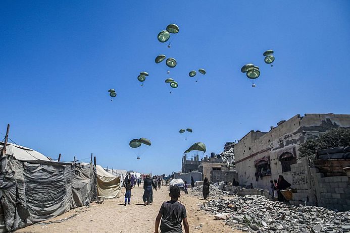Unter dem Druck der Vereinigten Staaten und einer Reihe europäischer Länder begann die israelische Regierung Ende Juli, begrenzte Hilfsabwürfe durch eine Gruppe von Staaten, darunter Jordanien, Kanada und Frankreich, zuzulassen. Dies wird von den UN und Nichtregierungsorganisationen, darunter auch medico international, einstimmig als schlechtmöglichste Variante für Hilfslieferungen kritisiert. Die Kosten für Luftabwürfe sind zwischen 42 und 100 Mal höher als über den Landweg, Flugzeuge können bestenfalls nur die Hälfte dessen transportieren, was ein LKW transportieren kann, und bei den ersten Luftabwürfen im Jahr 2024 kamen Dutzende Menschen ums Leben. Auch jüngst sind wieder Aufnahmen von Luftabwürfen zu sehen, die Sachschäden provozieren und Menschenleben gefährden.