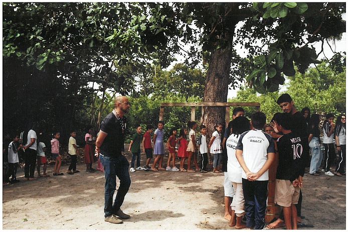 Gegen Ende unseres Gesprächs mit Paulo França strömen die Kinder der Nachmittagseinheit aus dem Schulgebäude, bilden auf dem Platz unter dem Cashew-Baum, der für die indigene Gruppe der Anacé heilig ist, einen großen Kreis. In der Mitte stehend, zusammen mit einem Schüler und einer großen Trommel, stimmt Schulleiter Marcelo ein Ritual an. Die gemeinsame Zeremonie ist Teil ihres Kampfes um die Wahrung der eigenen indigenen Identität und der territorialen Selbstbestimmung, inmitten einer Zeit, die ihnen erneut das Recht auf Mitbestimmung über das eigene Leben abspricht. Lehrer:innen wie Schüler:innen singen in einem Mix aus Anacé und Portugiesisch, tanzen im Kreis, schwenken rhythmisch Maracas dazu. Hoch oben in der Baumkrone bewegt sich geschickt ein kleines Äffchen, letzte noch unreife Cashew-Früchte hängen an den Ästen.