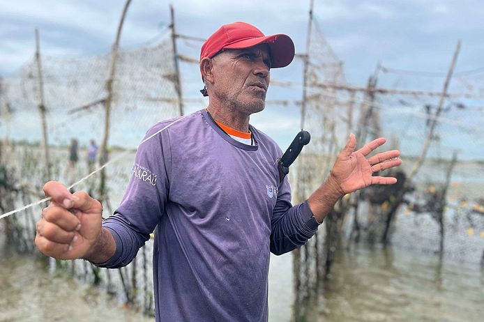 Der Tag neigt sich dem Ende zu und damit auch die Arbeit von José Nilson. Sein von der Gischt feuchtes Trikot der brasilianischen Fußballnationalmannschaft hat er noch schnell gegen ein sauberes orangefarbenes Poloshirt umgetauscht, bevor er sich auf der Veranda des Gemeindezentrums von Curral Velho einfindet. In dem Dörfchen an der Atlantikküste des brasilianischen Bundesstaats Ceará leben knapp 800 Familien, ungefähr 2000 Menschen. José Nilson ist 53 Jahre alt und seit nunmehr vier Jahrzehnten Fischer. Sein halbes Leben hat sich auf dem Wasser abgespielt: “Ich fahre um vier Uhr früh mit meinem Boot los. Manchmal auch um fünf, das hängt von der Flut ab. Dann bin ich zehn, zwölf Stunden draußen.” Der Klang seiner unaufgeregten Stimme vermischt sich mit der Ruhe, die seine sanften Augen ausstrahlen. “Hier gibt es Arbeit auf dem Meer. Es ist schwierig, in der Stadt einen Job zu finden. Also muss man auf dem Meer jagen. Manchmal gibt es mehr Fische, manchmal weniger. In letzter Zeit werden es aber eigentlich immer weniger.”