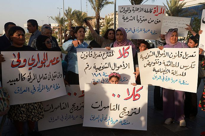 Viele Parlamentarierinnen haben sich zusammengeschlossen, um gegen das Gesetzesvorhaben vorzugehen. Dies ist in der irakischen Parlamentsgeschichte ein einmaliger Vorgang. Sie haben alle männlichen Abgeordneten aufgerufen, nicht im Parlament zu erscheinen, damit dieses Vorhaben gar nicht erst diskutiert werden kann. Es gab Demonstrationen, die von der Frauenbewegung organisiert wurden und für die sehr breit mobilisiert wurde – Journalistinnen, Anwältinnen, aktuelle und ehemalige Parlamentarierinnen sowie die Studierendenschaft beteiligten sich klassen- und konfessionsübergreifend. Es herrscht Einigkeit in der Frage, dass für ein solches Gesetz kein Platz im Irak herrscht.