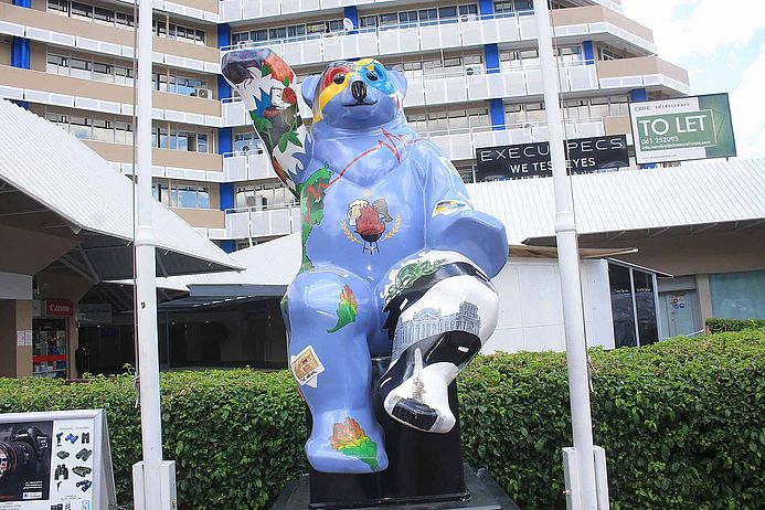 Dafür gibt es in Windhoek jetzt eine neue Statue. Mitte Oktober reiste Berlins Regierender Bürgermeister Kai Wegner anlässlich des 25-jährigen Jubiläums der Städtepartnerschaft in die namibische Hauptstadt. Es ging um wirtschaftliche Beziehungen, Sicherheitsfragen und „Verantwortungsübernahme“. Bei dieser Gelegenheit weihte Wegner vor der deutschen Botschaft als Zeichen der „tiefen Verbundenheit zwischen den beiden Städten und Staaten“ einen bunten Berliner Buddy Bär en ein. Er lächelt und hebt die rechte Tatze zum Gruß.