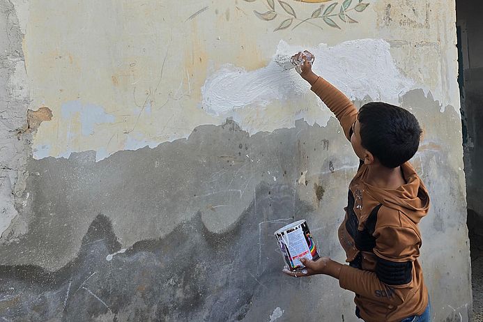 Am letzten Tag des Treffens streichen Kinder hier Wände und pflanzen Bäume. Mahmoud bringt Setzlinge mit – ärgert sich aber, weil sie viel zu spät geliefert wurden. Genehmigungen? Behörden? Fehlanzeige. Menschen tun, was getan werden muss. Hier treffen Erfahrungen aus ganz Syrien zusammen – und formen einen Gegenentwurf zur staatlichen Vorstellung von Wiederaufbau.