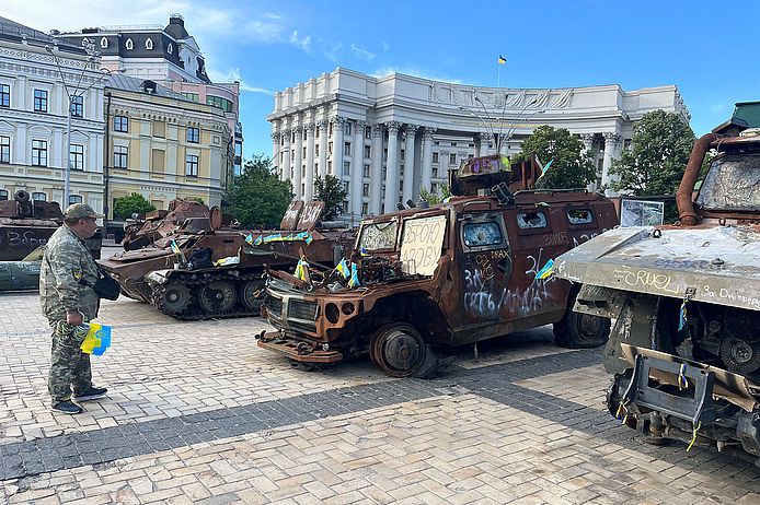 Das erinnert an Zwischentöne, die bereits im ersten Kriegsjahr vereinzelt zu vernehmen waren. Sie lehnten es ab, die Konflikte in der Ukraine allein auf die völkerrechtswidrige Annexion der Krim, die Besetzung von Teilen der Oblaste Luhansk und Donezk oder den verbrecherischen Angriff Russlands im Februar 2022 zurückzuführen. Die Vereindeutigung und Verengung auf eine monolithische nationale Identität wird die Ukraine nicht reicher machen – auch wenn es für diesen Blickwinkel keinen Raum geben mag, solange das Land im Kriegs- und Ausnahmezustand ist. Krieg ohne Ende „Kyiv ist waiting for you after the victory“ heißt es auf Werbetafeln im Stadtzentrum, die Siegesgewissheit vermitteln sollen – so wie die erbeuteten russischen Panzer, die vor dem Außenministerium stehen. Von der teils euphorischen Stimmung der ersten Monate, der Einigkeit in der kollektiven Landesverteidigung, ist jedoch nicht mehr viel zu spüren. Die anfängliche Hoffnung auf ein durch westliche Militärhilfe ermöglichtes, schnelles Ende des Krieges ist einer Ernüchterung gewichen, die zwar oft noch vom „Sieg“ spricht, aber kaum noch an ihn zu glauben scheint. Darüber kann auch der jüngste Vormarsch der Ukraine auf russisches Gebiet nicht hinwegtäuschen.