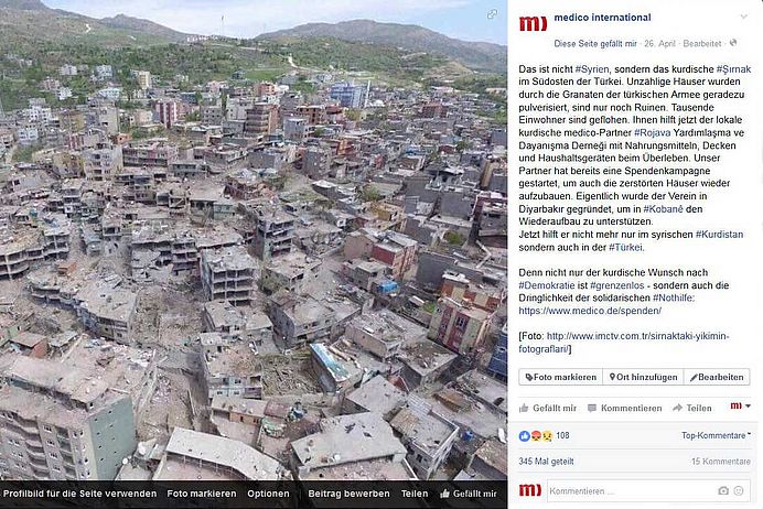 medico unterstützt die Nothilfe unseres Partners in Diyarbakır mit 20.000 Euro. Der Rojava-Verein versorgt ausgebombte und zur Flucht gezwungene Familien in Diyarbakır-Sur, Silopi, Şırnak, Cizre, Nusaybin, Dargeçit, Derik, Silvan. Es können neue Städte hinzukommen – niemand weiß, was werden wird.