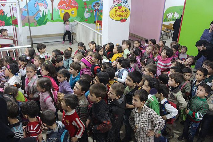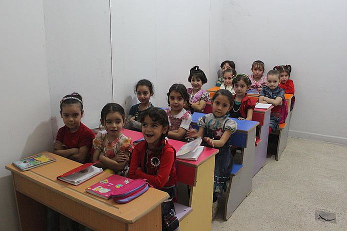Um den Kindern in Erbin einen Alltag und eine Zukunft zu ermöglichen, setzt sich das Basiskomittee von Erbin seit 2013 für einen kontinuierlichen Schulunterricht ein. 2.400 Schülerinnen und Schüler werden im kommenden Schuljahr von 180 Lehrkräften in sechs verschiedenen Schulen unterrichtet. Die Schulen müssen unter der Erde liegen und haben keine Fenster, damit die Schülerinnen und Schüler vor den anhaltenden Luftangriffen geschützt sind und nicht von Splittern verletzt werden.