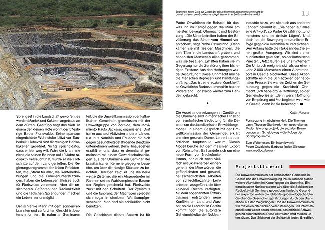 Die Gegnerinnen und Gegner der Uranmine in Caetité sammeln sich in der örtlichen katholischen Gemeinde, die von Padre Osvaldinho Barbosa geleitet wird. Der von der Befreiungstheologie geprägte Padre stammt selbst aus dem Sertão und kennt die Sorgen und Nöte der Kleinbauern, deren Existenz und Gesundheit von der Uranmine bedroht ist. Mit dem engagierten Priester und der Journalistin Zoraide Vilas Boas, die die lokale Umweltbewegung mit Wissen und Verbindungen in die Bundeshauptstadt Salvador unterstützt, fahren wir in das Abbaugebiet, das wie eine Sicherheitszone eingezäunt und bewacht ist. Vom Zaun aus werfen wir einen Blick auf das riesige Gelände. Die Mine breitet sich schweigend und unschuldig vor unseren Augen aus. Um sie herum liegen die kleinen Bauernhöfe wie Sprengsel in die Landschaft geworfen, es werden Maniok und Kakteen angebaut, an dem dürren Gestrüpp nagt das Vieh.