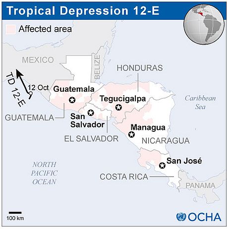 Nach dem tropischen Tief 12-E sorgt nun der Tropensturms "RINA" für Dauerregen in Mittelamerika. Rund 600.000 Menschen sind betroffen, fast 100 starben. Am schlimmsten ist die Situation in Guatemala und El Salvador. Hier wurden die heftigsten Regenfälle seit 50 Jahren gemessen.