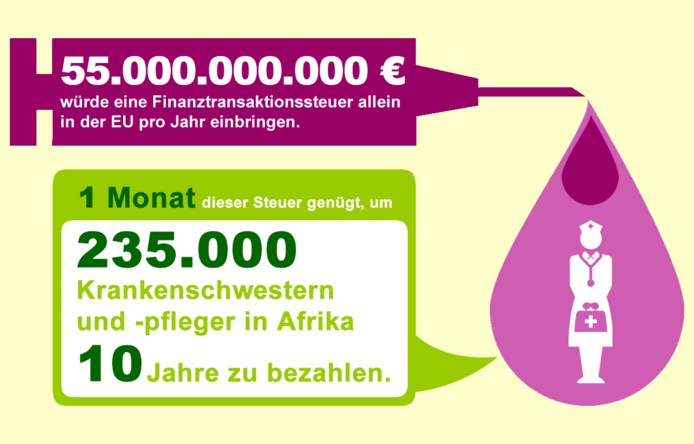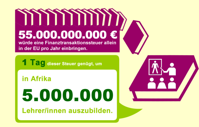 Die globale Finanzwirtschaft hat eine weltweite Krise verursacht, aber bisher keinen wirksamen Beitrag zur Bewältigung der Krisenfolgen erbracht. Die Industriestaaten setzten etliche Milliarden Euro ein, um die Folgen abzufedern. Daher wird der Ruf nach einer wirksamen Finanztransaktionssteuer immer lauter. Nur: Dazu gehört auch das Bekenntnis, dass ein Teil der Steuereinnahmen für die weltweite Bekämpfung von Armut und Klimawandel verwendet wird! Das ist jedoch nicht im Sinne der EU.