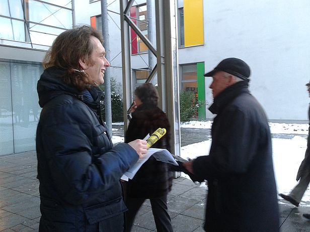 Ausgerüstet mit Schutzmasken und Bannern stehen auch wir vor dem Eingang und verteilen Informationen über die Situation Fischer und Anwohner des Stahlwerkes in der Bucht von Rio de Janeiro. Wir – das sind Vertreterinnen und Vertreter des Dachverbands kritischer Aktionäre, der Brasilien-Initiative KOBRA, des Forschungs- und Dokumentationszentrum Chile-Lateinamerika (FDCL) nd zum ersten Mal auch medico international. Seit vielen Jahren kritisieren Markus Dufner (kritische Aktionäre), Christian Russeau (FDCL) und Marcos da Costa Melo( Kobra) an diesem Ort die Fehlinvestition in Brasilien, die Menschenrechtsverletzungen, die das Stahlwerk durch die Zerstörung der Bucht und die gesundheitsschädlichen Emissionen an 8000 Fischern und 40.000 Anwohnern zu verantworten hat. Früher seien sie oft beim Verteilen der Informationen unflätig beschimpft worden, berichten sie. Dieses Jahr finden die Flugblätter guten Absatz. Jeder und Jede weiß hier, dass das mehrheitlich von ThyssenKrupp getragene Stahlwerk in Brasilien einer der Gründe dafür ist, dass es zum ersten Mal keine Dividende für Aktionäre geben wird. Die Aktionäre fühlen sich als Opfer einer kurzfristigen Gewinnstrategie und da haben sie auf einmal etwas mit den 8000 verarmten Fischern und den gesundheitlich beeinträchtigen Anwohnern in der Bucht von Rio gemeinsam.
