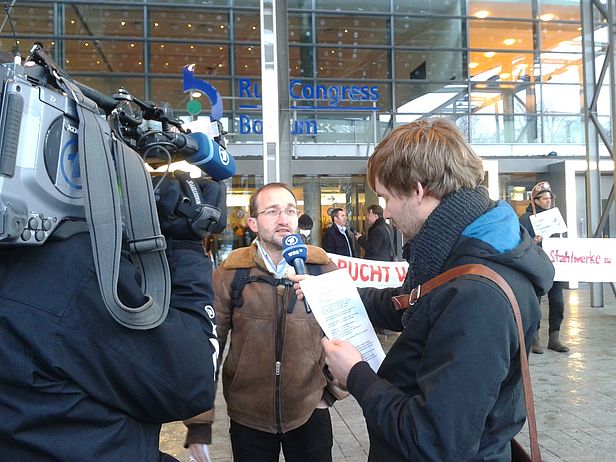 Am Ende der Versammlung wurden Vorstand und Aufsichtsrat entlastet. Aber das Abstimmungsergebnis für Cromme war eine Ohrfeige. Statt 95 Zustimmung wie im letzten Jahr erhielt er nur noch 69 Prozent, schlechter schnitt nur das ehemalige Aufsichtsratsmitglied, der SPD-Kanzlerkandidat Peer Steinbrück ab. Für die Entschädigungsforderungen der Anwohner und Fischer wird sich das Bündnis aus medico, kritischen Aktionären, FDCL und Kobra weiter einsetzen. Ob wir nächstes Jahr wieder vor der Aktionärsversammlung stehen werden, ist fraglich. Denn ThyssenKrupp tut alles, um die Betriebe in Amerika loszuwerden.