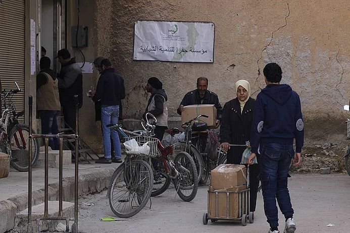 Der syrisch-palästinensische medico-Partner Jafra Foundation organisiert seit Beginn des Bürgerkrieges humanitäre Hilfe für die Eingeschlossenen in Jarmuk und angrenzenden Stadtteilen. Zuletzt konnten im Januar und Februar 4.000 Lebensmittelpakete und 2.000 Hygienekits an insgesamt 2.000 Familien in Jarmuk und Yelda verteilt werden. Damit leistet Jafra mit Unterstützung von medico international und Mitteln des Auswärtigen Amtes einen essentiellen Beitrag zur Überlebenssicherung der Menschen.