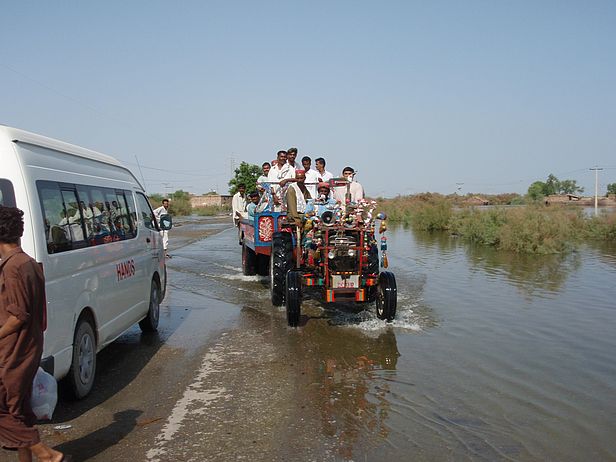 Alle verfügbaren Mitarbeiter und Mitarbeiterinnen sowie rund 10.000 Freiwillige waren viele Tage und Nächte im Einsatz. Zudem mietete HANDS Boote und Traktoren mit großen Anhängern, um die Menschen aus den gefährdeten Zonen an sichere Orte zu bringen. Der medico-Partner arbeitet schon seit über dreißig Jahren in den Provinzen Sindh und Belutschistan.