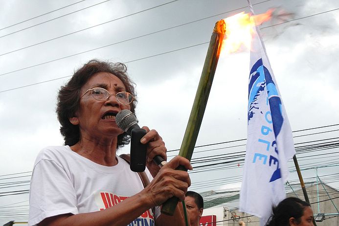 Ganz vorne mit dabei ist Dr. Efleda Bautista. Sie promovierte einst in Frankfurt am Main in Erziehungswissenschaften über „Pädagogik in der Dritten Welt“. Später unterrichtete sie auf den Philippinen und war Vorsitzende der Lehrergewerkschaft. Nach der Pensionierung zog sie zurück in ihre Heimatstadt Tacloban. Dann kam der Taifun. Empört über die Untätigkeit der Regierung, suchte sie nach Mitstreitern – und fand sie, schnell und in großer Zahl. Ein Jahr später ist die erfahrene Politaktivistin zum Sprachrohr der Katastrophenüberlebenden geworden. „Niemals werden wir die Unfähigkeit der Regierung Aquino vergessen, die 18.000 unserer Verwandten und Freunde das Leben gekostet hat“, beginnt sie ihre Rede.